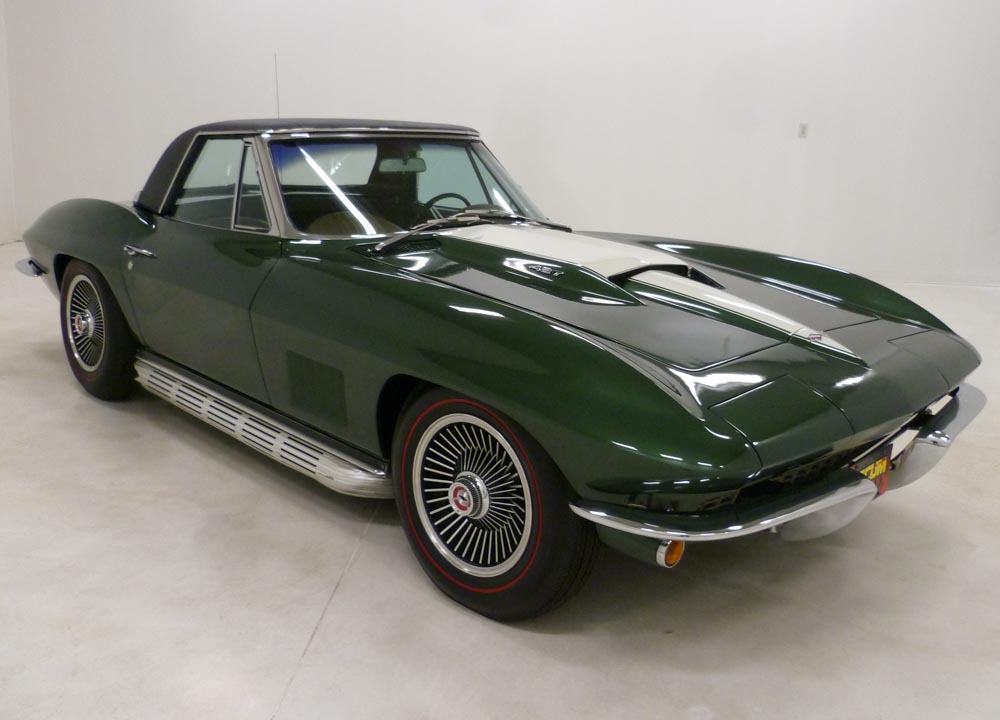1031R..1967 Corvette Convertible, two tops, 427-390 hp, 4 speed, numbers matching original motor, also has factory original body/trim tag, 36,898 actual miles. Goodwood Green paint with White stinger, Saddle Tan interior and White soft top. Body-on restored in excellent condition with NO HIT nose with grill tab in place and excellent paint, interior, chrome, stainless, exhaust, brakes, wheels, and tires. Also has an affirmation by CCAS/Grenning as to the legitimacy and originality of the engine block, stamp pad, and the engine stamp. Optioned with factory side exhaust, shoulder harness, black vinyl hardtop, 3.36 posi, SS brakes, AM/FM radio, tinted glass, B.O. aluminum wheels and 7.75x15" red stripe tires. Most all factory correct type components including the spare, floor mats, seat belts, washer system, shifter, shielding, braided wires, air cleaner, most hoses, hose clamps, ball joints, radiator, gas door assembly, Bowtie mirror, glove box door, owners manual, and sales brochure. Documented with tank sticker/build sheet (still on tank), CCAS/Grenning Engine Stamp Affirmation, owner history, owner manual packet, photos of tank sticker and 3-ring binder. From the same owner of 29 years purchasing it from ProTeam in 1994. Production date of December 28th, 1966 and delivered new by Lappley Chevrolet in Oregon, WI (dealer code 399 in zone 61) per official NCRS/GM Shipping Data Records (SDR). Looks, runs, and drives excellent. CC:+2 Consigned to Mecum Kissimmee Collector Car Auction January 15th - 17th, 2026