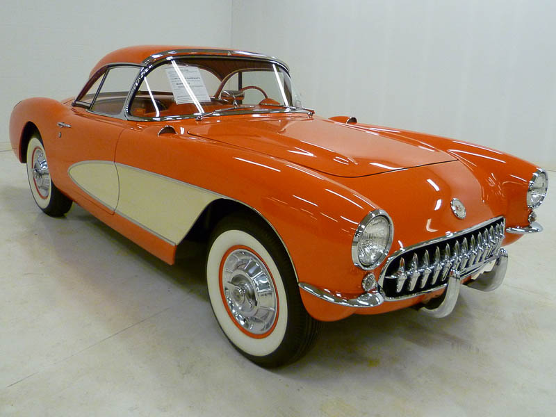 1004W..1957 Corvette Duntov Convertible Hardtop, 283-270 hp, (2x4s), 3-speed, numbers matching. Venetian Red paint with Beige coves and Red interior. Body-off restored by NCRS judge (Ed Hoffman) resulting in a plethora of awards that include two Bloomington Gold awards, four NCRS Top Flight awards, the NCRS (PV) Performance Verification award and the coveted NCRS Duntov Mark of Excellence award. The most recent awards include: Bloomington Gold (2025), Class Award at the Amelia Concours d'Elegance (2025) and the Bill Rudd Memorial award at the Cincinnati Concours d'Elegance (2025). This restoration included blue printing the motor with a Duntov cam and #997 heads. The expenses involved in obtaining these awards would surely exceed $20,000.00. These type restorations normally cost between $125,000.00 to $150,000.00. Radio, heater, and soft top delete car optioned with auxiliary hardtop, posi, dual fours, off road exhaust, hubcaps, and vintage 6.70x15" wide white tires. Also has custom fit car cover. Most all factory correct type components including the spare, jack, jack tools, trunk mat, trunk liner, rebound straps, spiral shocks, shifter, air cleaners, generator, starter, distributor, hoses, hose clamps, hood alignment blocks, nine fin valve covers, hood pop-ups, fuel filter, carbs, guide Y-50 mirror, owners manual, sales brochure, and T-3 headlights. Documented with the original owners manual, California black license plates, restoration photos, NCRS Confirmation of Awards, show awards, certificates, and judging sheets all neatly organized in no less than 4 binders. Please note that the NCRS Duntov plaque was kept by a previous owner. Sold new at Lellis-Brooks Chevrolet in San Francisco, CA and called the Golden State its home until 2008. Production date of May 2nd, 1957. Looks, runs, and drives excellent. CC:1 $149,000.00