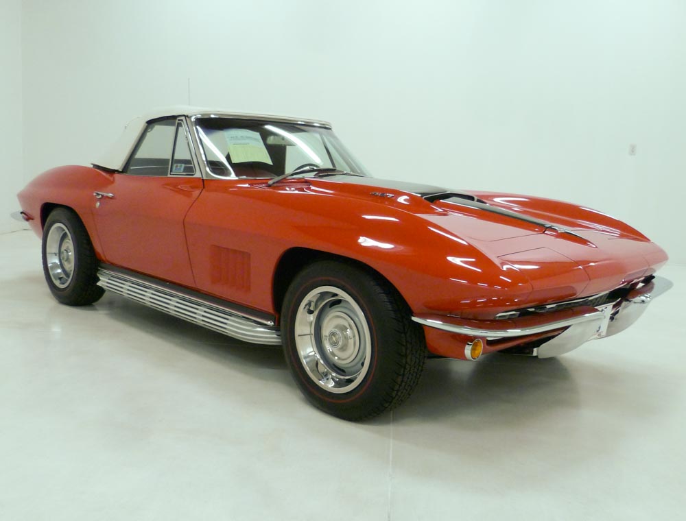 1001W..1967 Corvette Triple Crown Convertible, 427-390 hp, factory air, 4 speed, numbers matching motor, transmission and rear end. Rally Red paint with Black stinger, Red interior and White soft top. Super rare color combination. One of only 969 red vinyl interiors produced in 1967 with either Tuxedo Black, Rally Red, or Ermine White exterior body color! Body-off restored by Nabers Corvette Restoration of Houston, Tx. in show condition. NCRS Regional Top Flight award, Bloomington Gold certified, and Triple Crown award at the November 2006 Vette Fest National. These type restorations normally cost between $150,000.00 to $200,000.00. The best of the best gets even better with the option list of: factory air, factory side exhaust (born with), power steering, M-21, 3.55 posi, SS brakes, AM/FM radio, tinted glass, rallys, and red stripe tires. Most all factory correct type components including the spare, jack, jack tools, shocks, seat belts, washer system, shifter, shielding, braided wires, air cleaner, alternator, distributor, carb, hoses, hose clamps, window glass, valve covers, starter, radiator, gas door assembly, glove box door, warranty book, owners manual, sales brochure, and T-3 headlights. Documented with the tank sticker/build sheet, owners manual packet, warranty book, old registrations, owner history, title copies, NCRS/Bloomington certificates, Triple Crown award and judging sheets. Looks, runs, and drives excellent. CC:1 $229,000.00